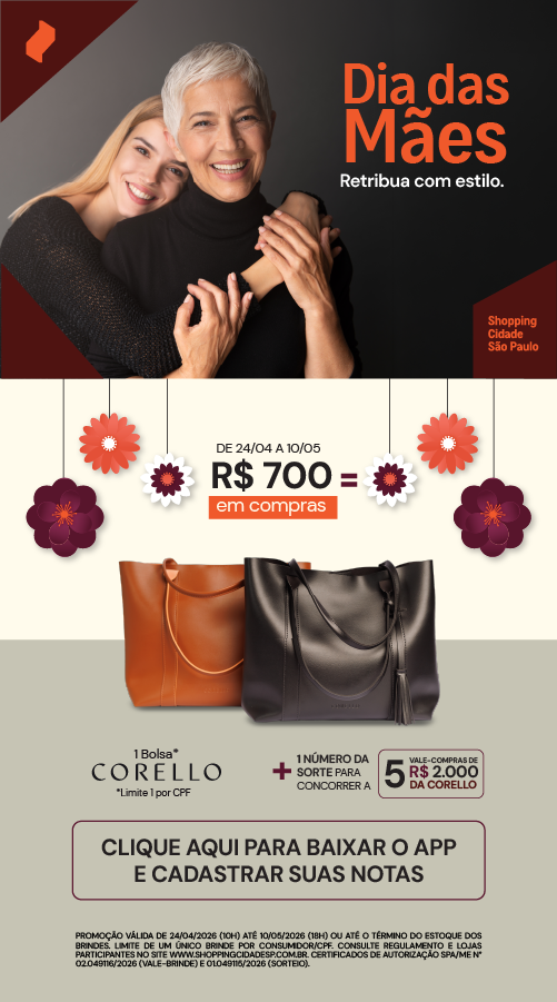 Escolha sua bolsa favorita nas cores preto ou caramelo e ainda participe do sorteio de 5 vale-compras de R$ 2.000 para usar na loja Corello do Shopping Cidade São Paulo.